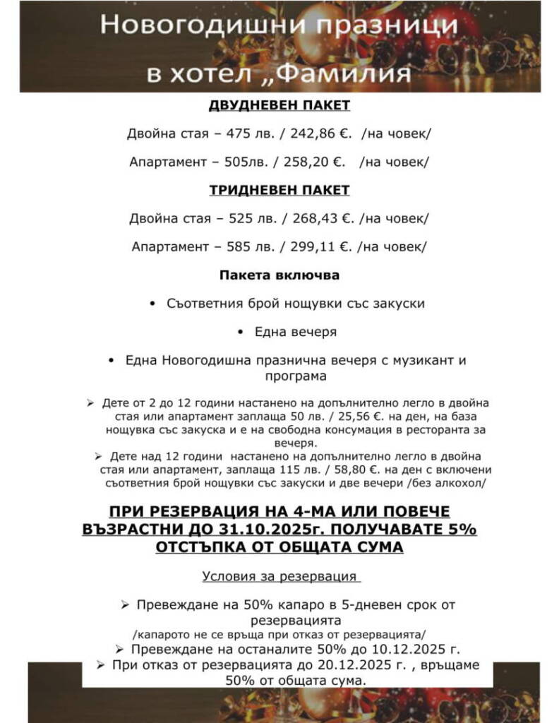 - Деца над 7 години или трети възрастен заплащат цената на допълнително легло.
